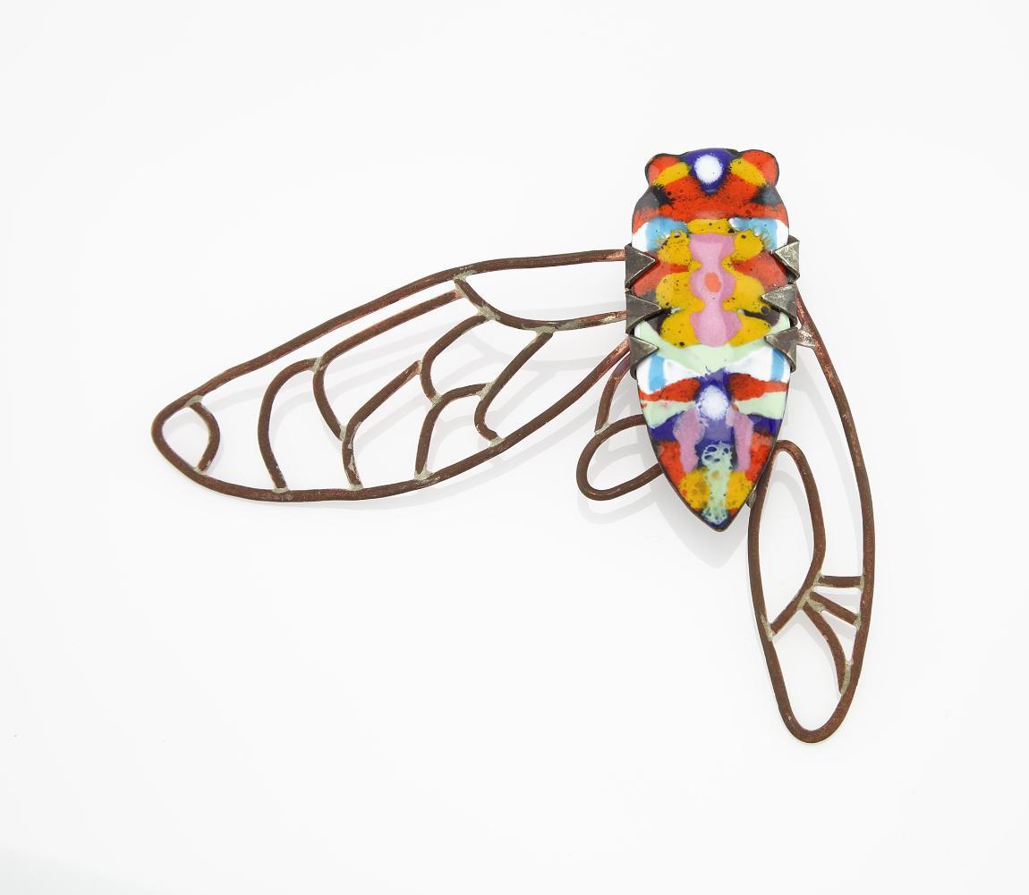 Student Art Work. Colorful insect-shaped brooch with a multicolored enamel body in red, yellow, blue, and pink, and delicate metal wire wings forming an open lattice pattern.