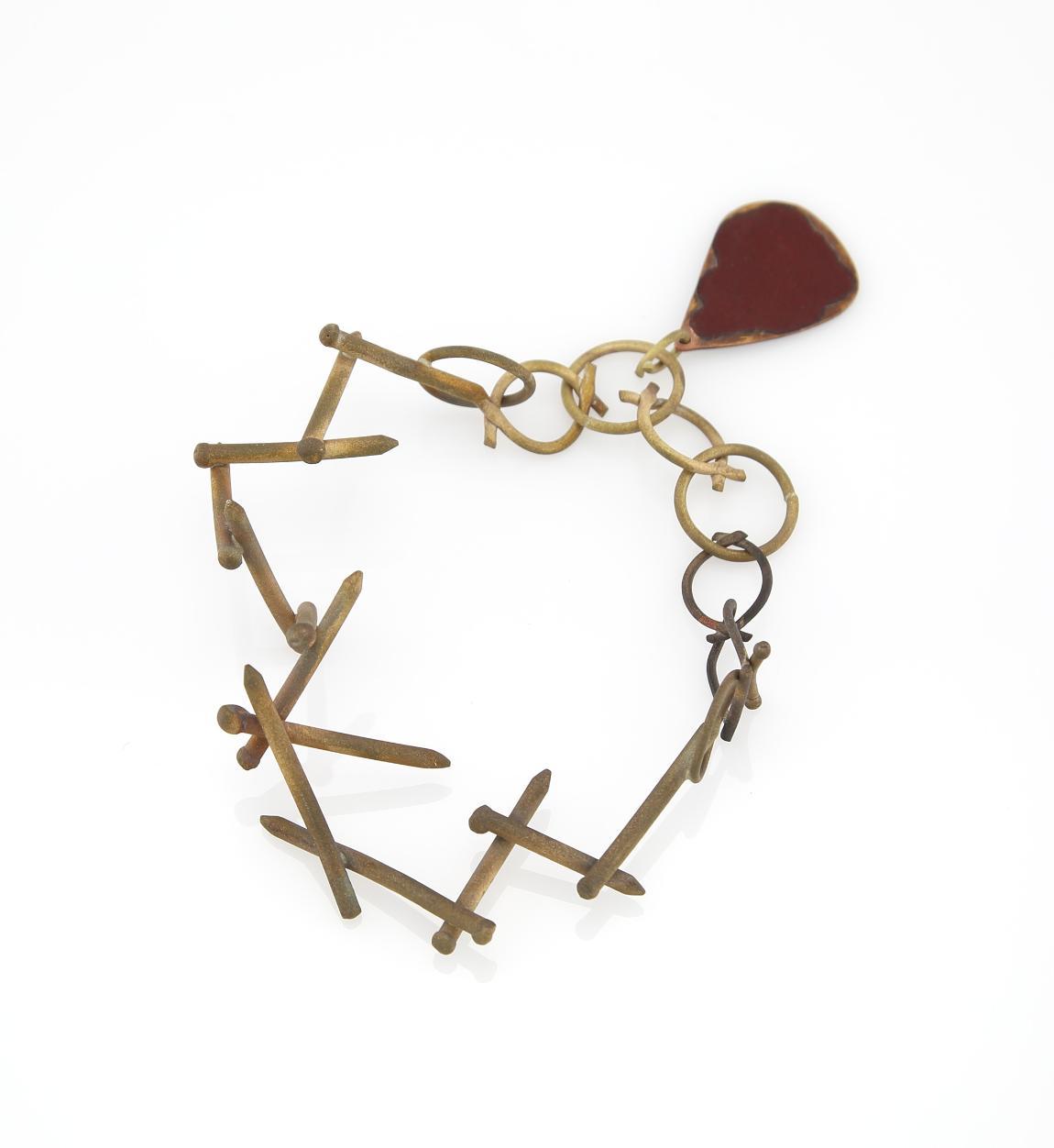 Student Art Work. Bronze bracelet made of intersecting nail-like metal pieces linked in a circular pattern, with a large reddish-brown teardrop charm attached to the clasp.
