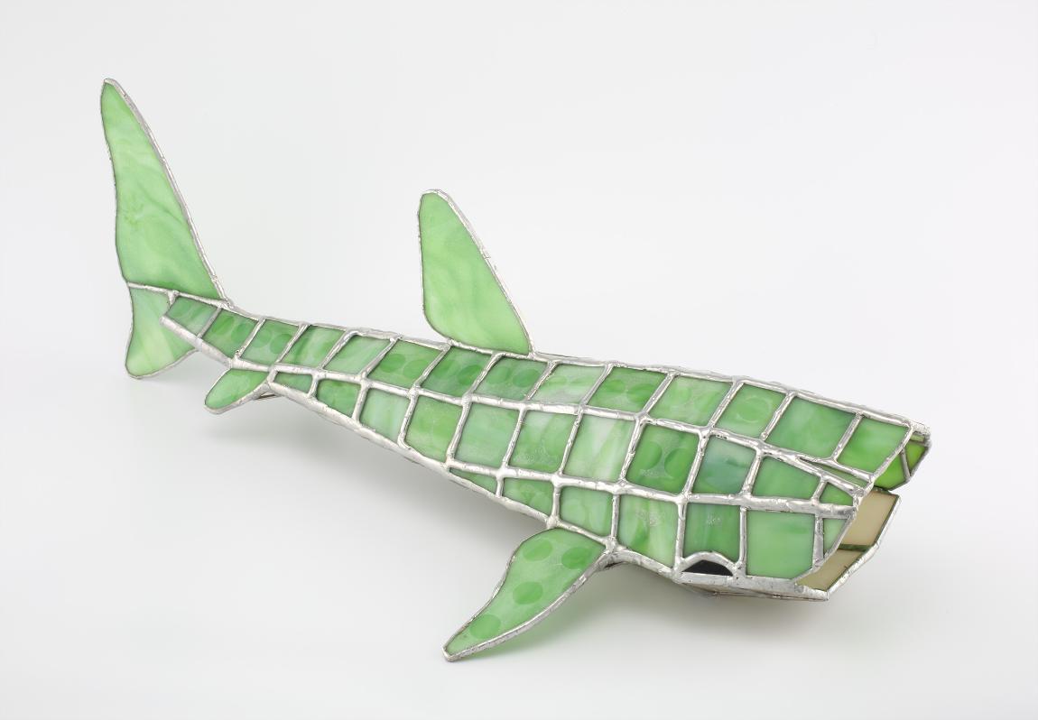 Student Art Work. Green stained-glass sculpture of a shark with a silver metal frame, featuring angular segments and a pointed tail and fins.