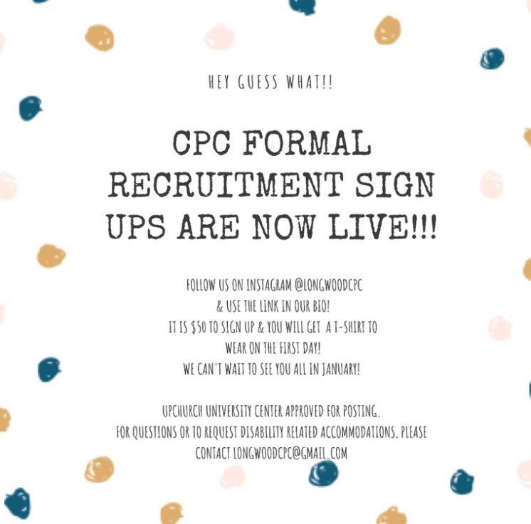 Sign up for CPC Formal Recruitment! Recruitment will be January 10th, 11th & 12th. There is a $50 fee to sign up for recruitment, but with this you will get a t-shirt to wear on the first day. More information can be found at http://www.longwood.edu/greek/organizations/college-panhellenic-council/recruitment/